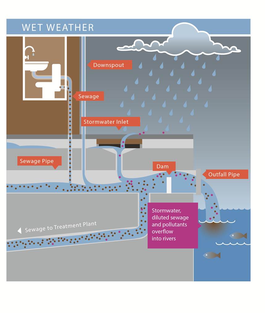 These treatment plants have a certain capacity they are able to treat and purify. Once this limit is exceeded, possibly due to increased rainfall, there are two options. Firstly, large storage containers can be used to store raw sewage until there is capacity to treat it. Alternatively overflow solutions are used to release waste into nearby water systems.